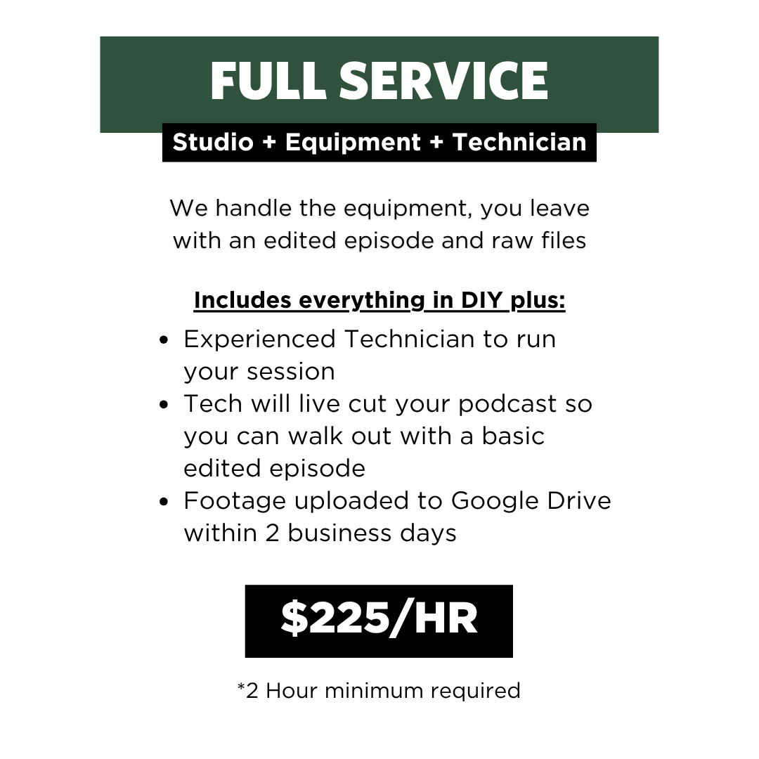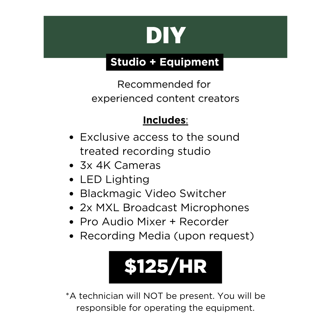 Includes space & equipment only **Recommended for experienced podcasters. Studio is not responsible for media delivery.